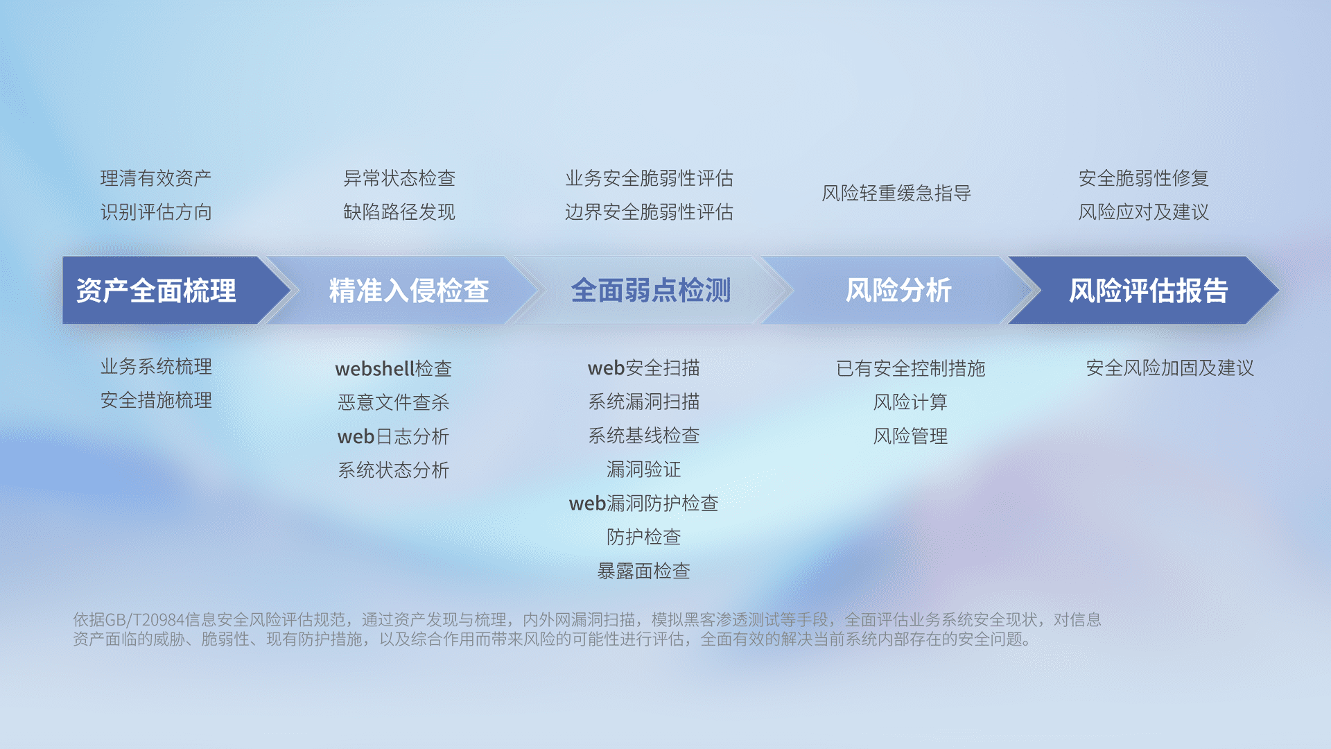 针对客户行业特性,,,以专业的安全服务+多厂商联合解决方案提供专属的一站式安全管理服务,,帮助客户全面感知网络空间威胁,,基于识别、、、检测、、、分析、、、、防护、、监测、、响应的服务理论模型,,从方案咨询、、、集成交付、、评估验证、、、、优化加固、、、运维运营,,,致力于为客户提供完整的闭环管理式安全服务。。。以实战经验为客户打造高抵御风险的安全体系,,,帮助客户发现威胁、、、、对抗威胁、、、处置威胁,,,,不断积累安全对抗能力,,,,持续保障数字化安全。。。。